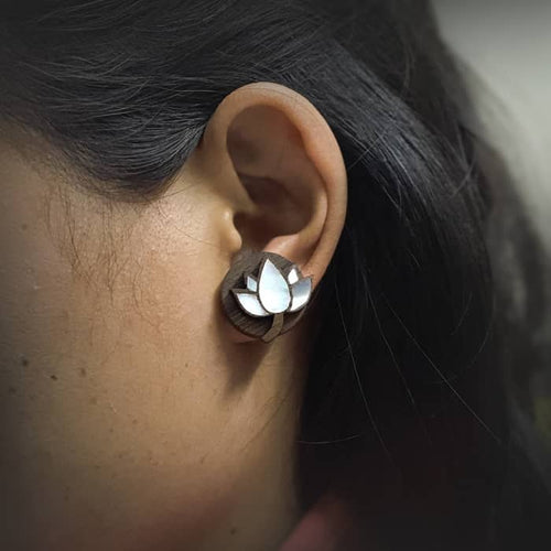 Unique White lotus earrings from Lotus series made out of wood and hand-inlaid mother of pearl.