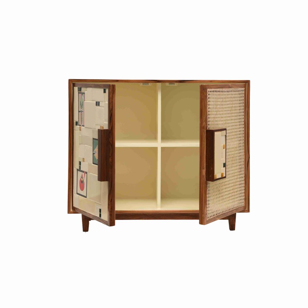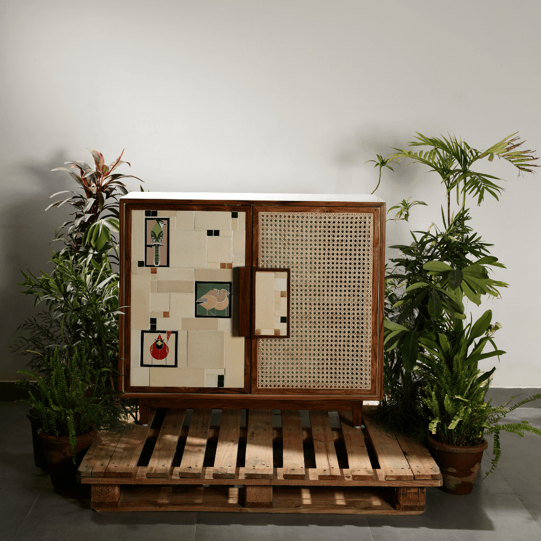Introducing our one-of-a-kind cabinet, a harmonious blend of artistry and nature-inspired design. Featuring a mosaic pattern of birds crafted from handmade tiles on one shutter, and cane detailing on the other, this piece brings the beauty of the outdoors into your home. Radiating warmth and charm, it creates an inviting ambiance reminiscent of natural serenity. Elevate your space with this unique fusion of craftsmanship and nature's elegance.