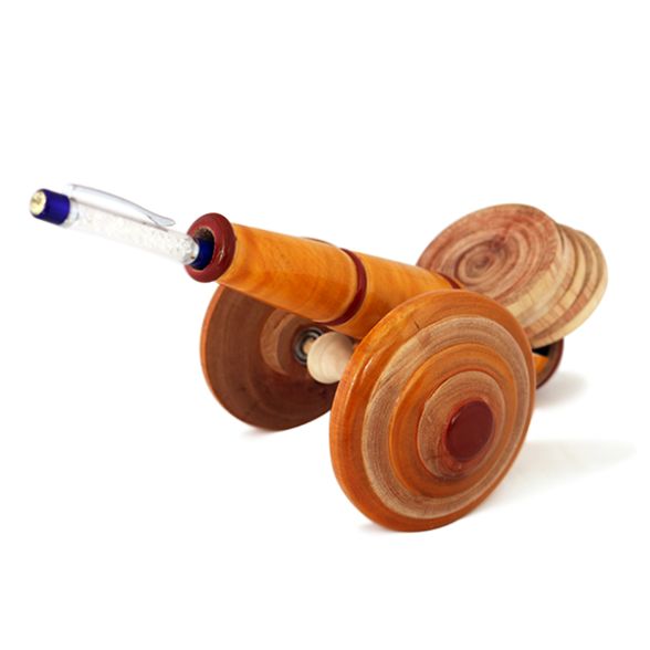 This Canon Coaster stand exhibits fine wooden turning with beautiful orange-red lacquering. The wobbly wheels move back and forth. Enhance its appearance by storing a pen in the firing hole. This is the masterpiece your table needs!