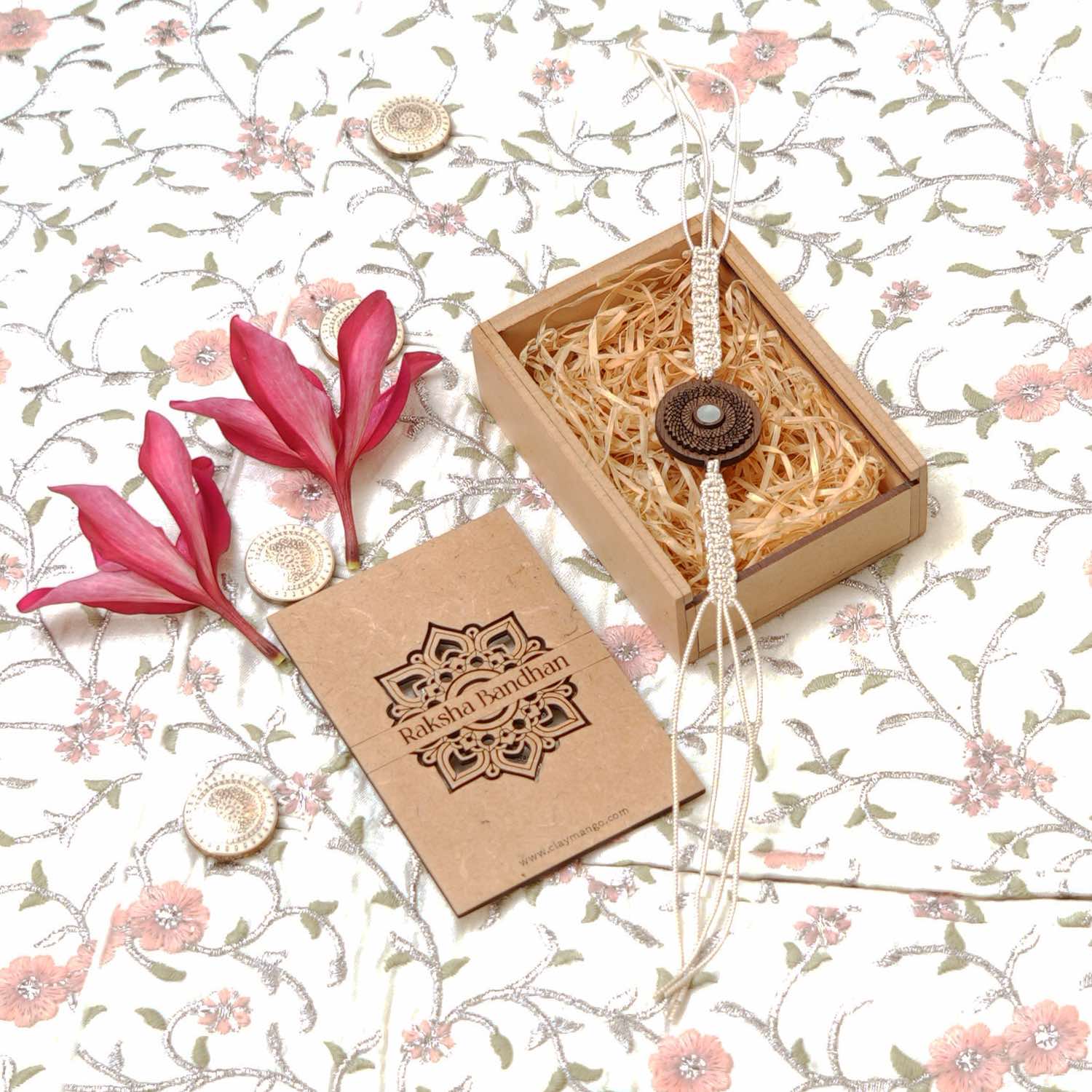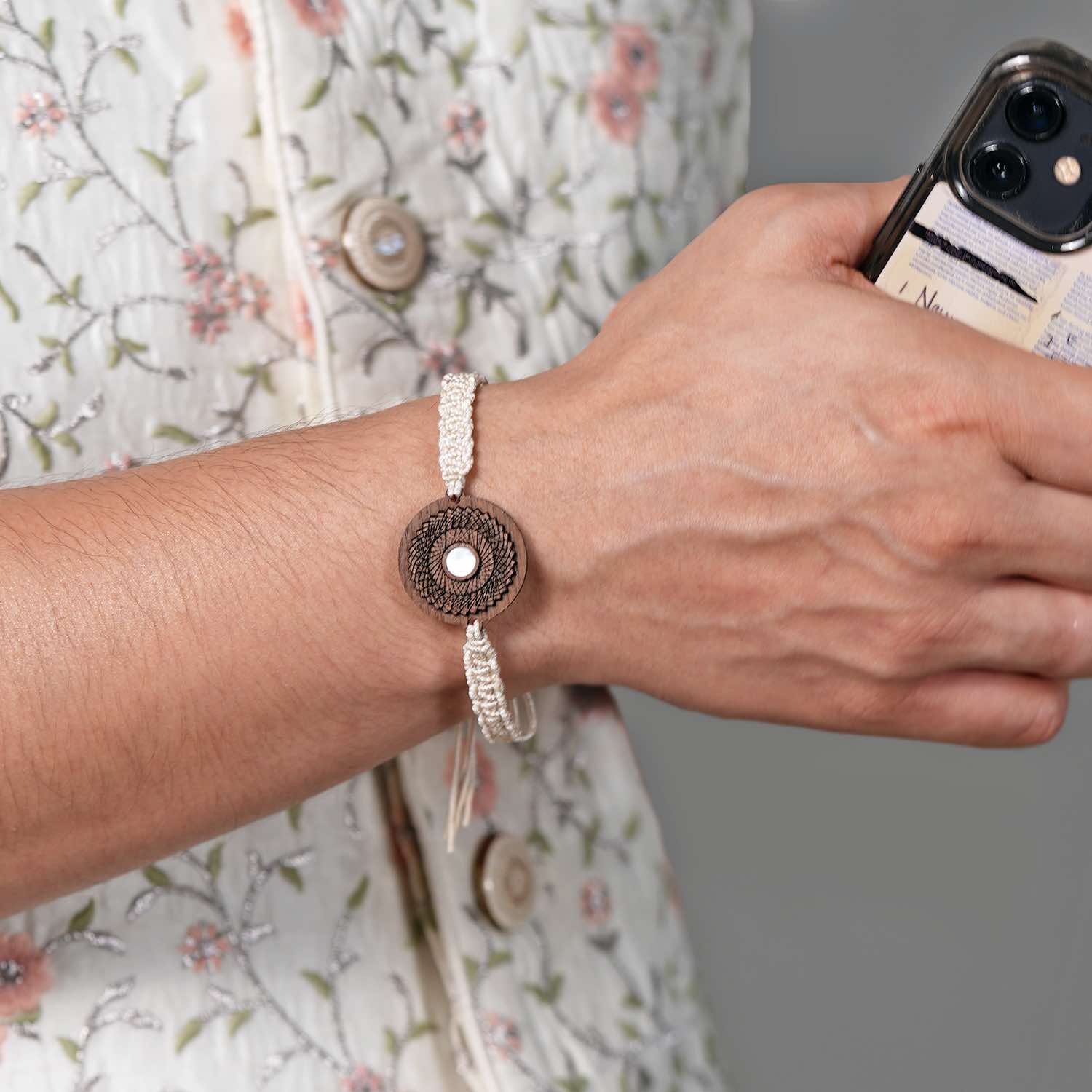 Taru(White)-Handcrafted Wooden & Mother-of-Pearl Rakhis with Silk yarn braiding – A Celebration of Design and Tradition