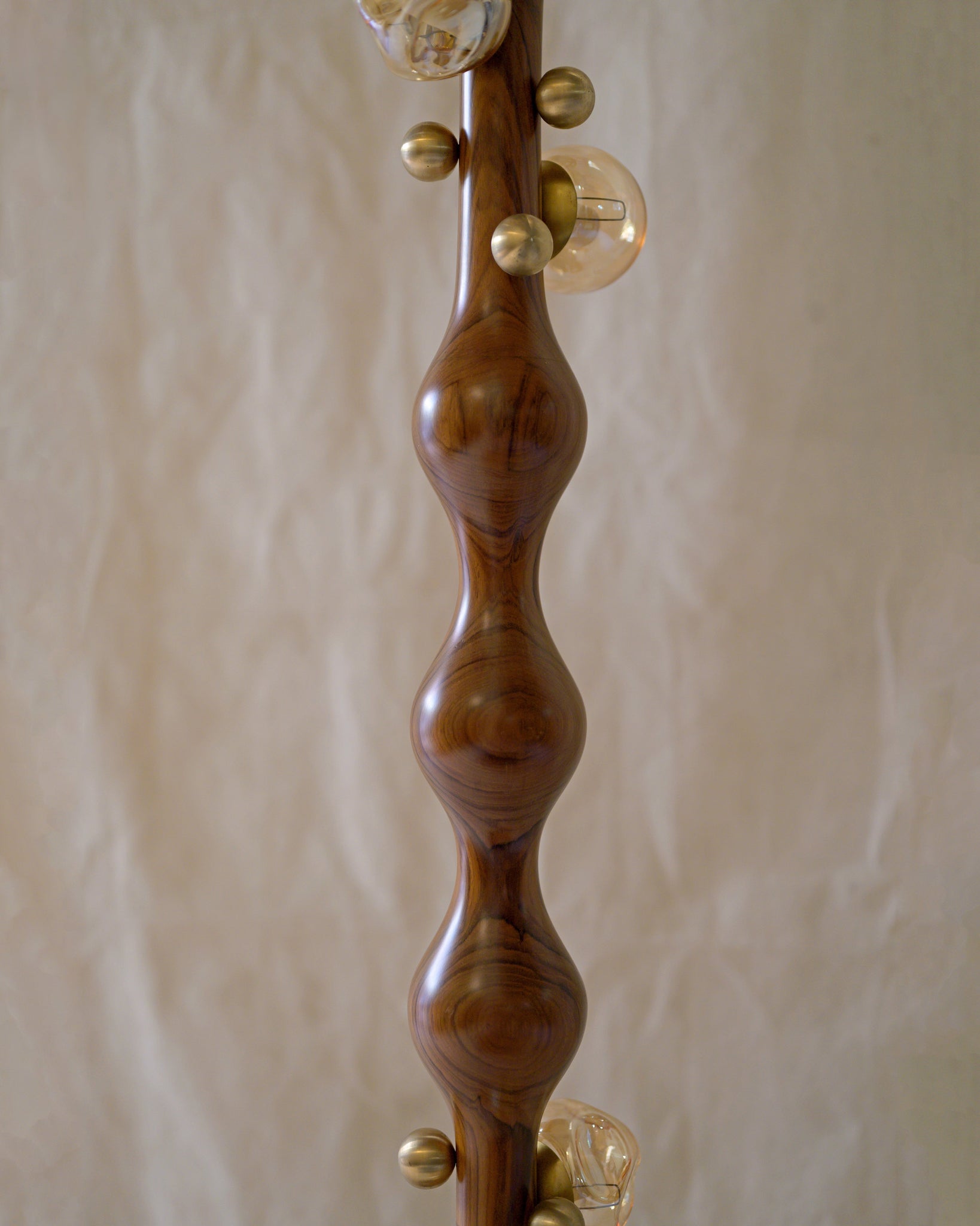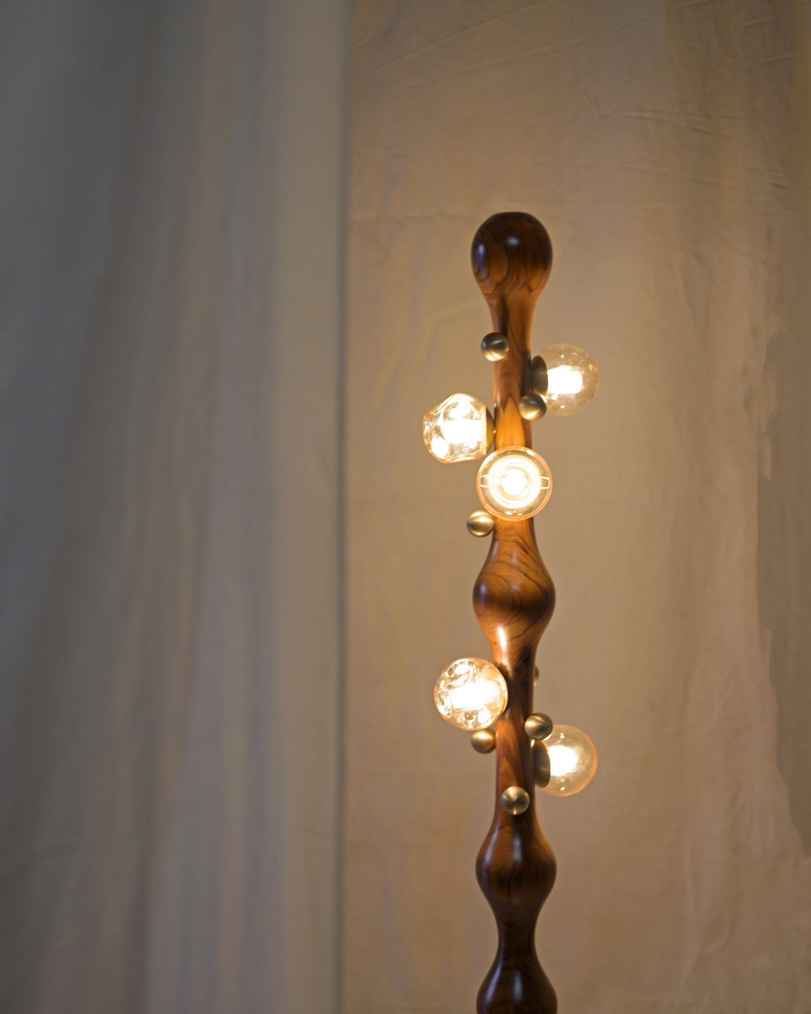 The Stem Floor Lamp is defined by its sculpted simplicity and gentle presence. Soft light radiates through tinted glass globes, bringing the natural grain and profile of the wood into focus.