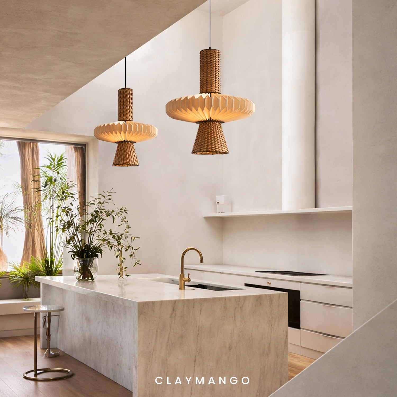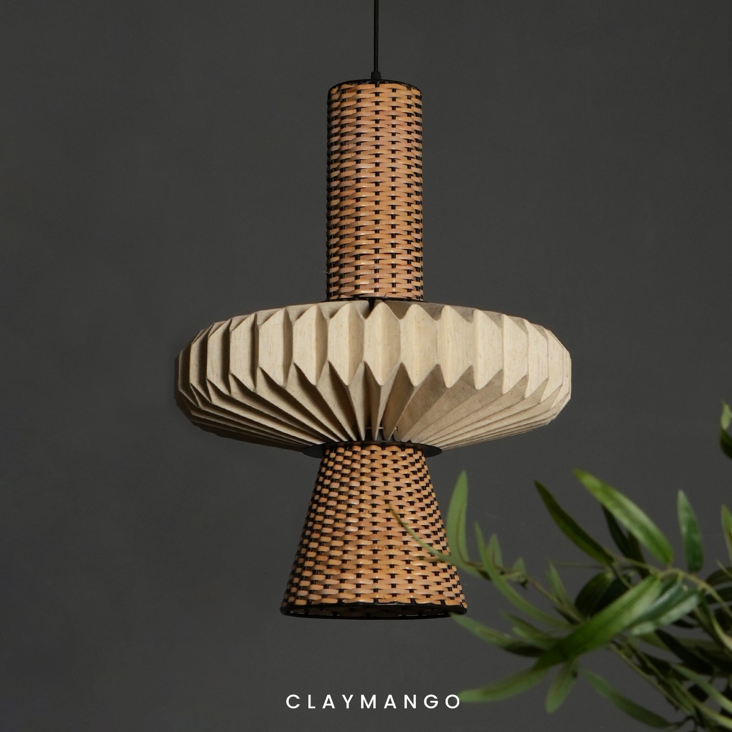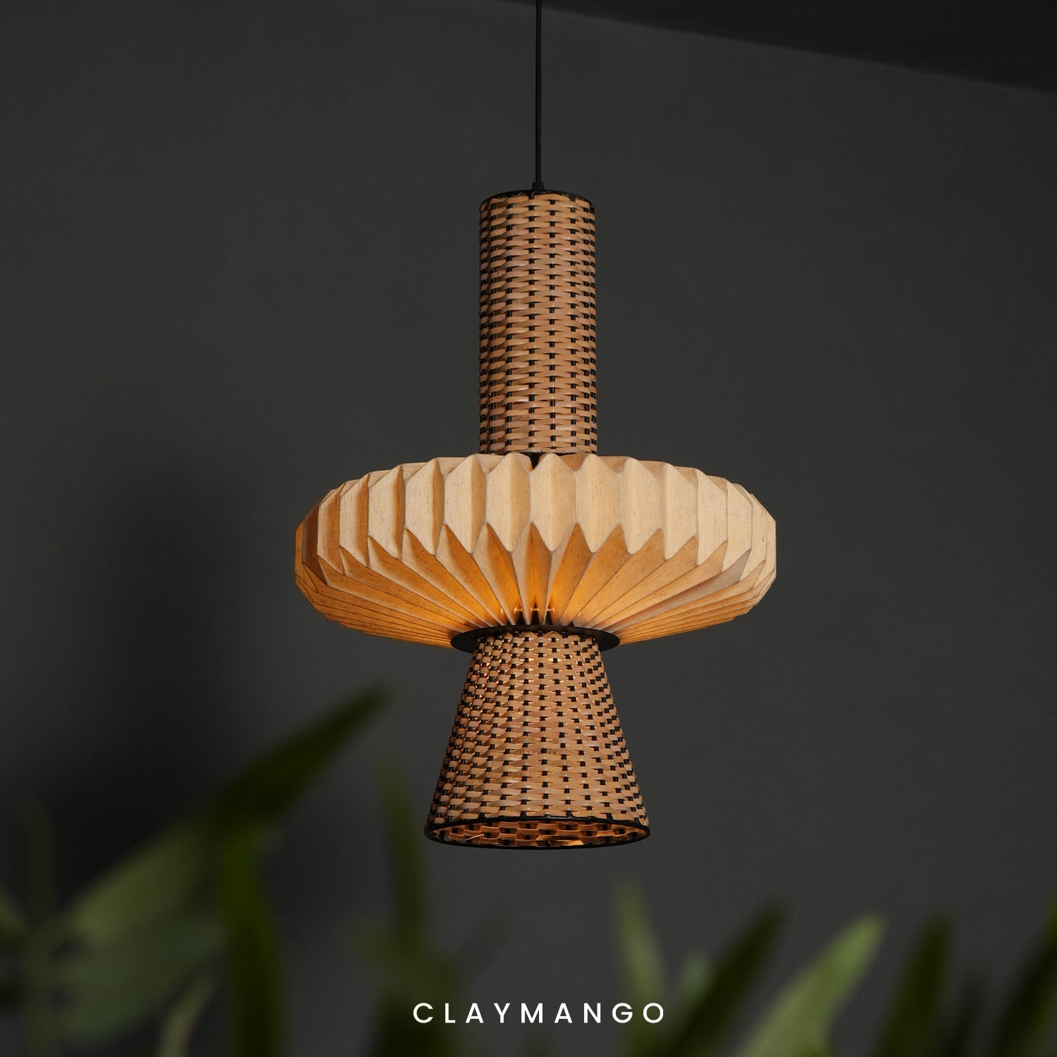 Theo is a sculptural expression of balance and texture, where structured metal meets the warmth of handwoven cane in a striking architectural form. Designed to stand out with quiet confidence, its layered silhouette creates a harmonious play between geometry and softness — making it both bold and refined. The natural cane weave gently filters light into a warm, inviting glow, while the crafted metal framework adds strength and modern contrast. Suspended above a dining table, kitchen island, or workspace, Theo becomes a statement centerpiece that enhances the atmosphere without overpowering it. Thoughtfully handcrafted, this pendant reflects Claymango’s commitment to timeless design, sustainable materials, and artisanal craftsmanship.